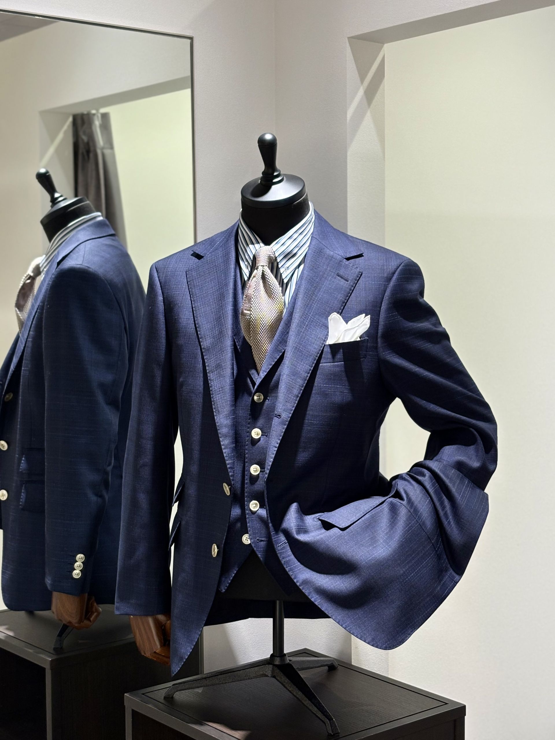 こういった織柄・綾目のしっかり入った生地であれば、上下2ピース・ベスト付3ピースでお仕立てされるとより使いやすいかと!!